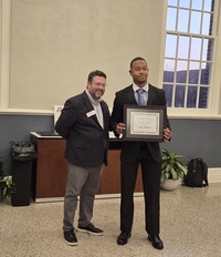 Cutline, BASE 2: Aidan Hayes (right) receives his award from Dr. Matthew Shaner, Director, Ole Miss BASE.